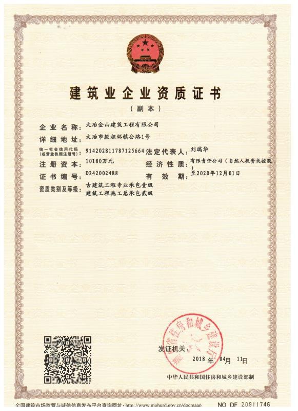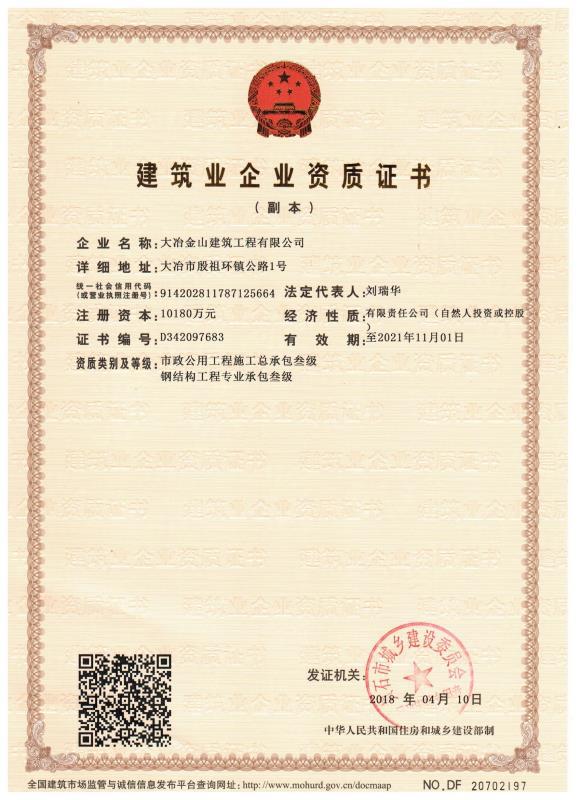 大冶金山建筑工程有限公司始建于1984年,屬鎮(zhèn)辦集體企業(yè)。1997年改制為大冶山建筑工程有限責(zé)任公司,屬股份制企業(yè)。2013年更名為大冶金山建筑工程有限公司,2018年3月公司資源重組,公司注冊資金達到10180.00萬元,公司法定代表人為劉瑞華。公司具有古建筑工程專業(yè)承包壹級、建筑工程施工總承包貳級、市政工程總承包叁級、鋼結(jié)構(gòu)工程專業(yè)承包叁級資質(zhì)。